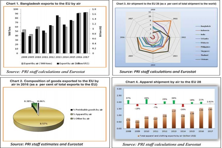 POLICY ISSUES: It is therefore quite evident that apparel and clothing accessories exports by air is on the rise for Bangladesh. Growth of 21 per cent was recorded in 2016, compared with 18 per cent in 2015 (Chart 4). This in a way also shows desperate attempts by exporters to meet delivery deadlines even in the face of higher transport costs that consequently affect their competitiveness. As long as security concerns at HSIA persist, costs will further pile up. Any issue in the domestic market - namely, gas or electricity supply issues, etc. - that increases the dependence of exporters on airfreight must therefore be identified and addressed. Given a situation where the dependence on airfreight cannot be curtailed, the concerned authorities should at least take the necessary steps to minimise the cost. While the neighbouring countries of India and Sri Lanka have already installed Morpho Explosives Detection Systems and Smiths Detection screening technology, respectively, it is astounding that a trade-focused country like Bangladesh lacked explosive tracking devices and other security measures before the issues were raised.