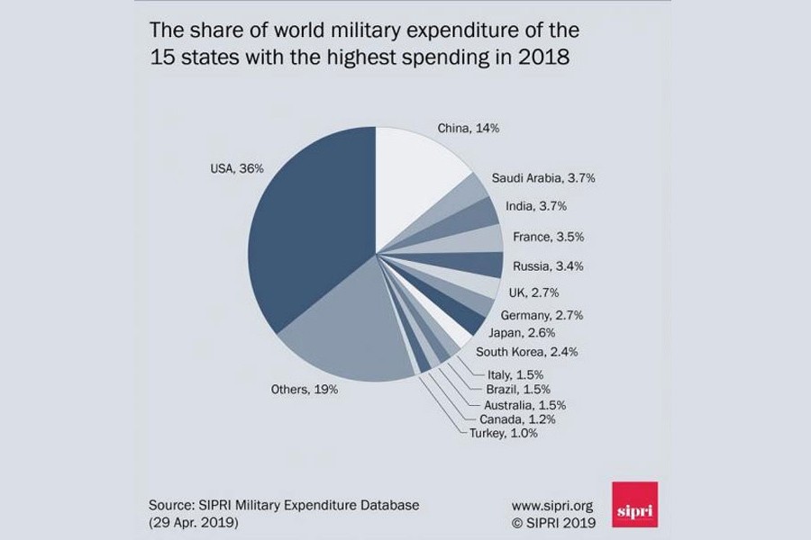Climbing military expenditures of ascending economic powerhouses today ring this alarm bell. This is a recent observation of the Stockholm International Peace Research Institute (SIPRI): we spent more money on the military in 2018 than we have ever spent since the Cold War ended, that is, since 1988, a whopping $1.8 trillion (Niall McCarthy, World Economic Forum, Newsletter, May 02, 2019). As the world's largest military spender, for sure the superpower United States fed this spiral, but it was the expenditure growth of lesser entrants that stole the show. Whereas US spending climbed for the first time since Nobel Peace Prize-winning President Barack Obama's second term began, three other countries spent a greater share of their gross domestic product (GDP) on weapons than the United States. China might automatically enter many a minds, but it is not one of them, in fact, it barely makes the top-10 spender's-list. Saudi Arabia's 8.8 per cent, Israel's 4.3 per cent, and Russia's 3.9 per cent lead that list, while tiptoeing the 3.2 per cent US figure were Turkey's 2.5 per cent, India's 2.4 per cent, France's 2.3 per cent, Australia's 1.9 per cent, which equals China's, followed by Canada's 1.3 per cent and Germany's 1.2 per cent