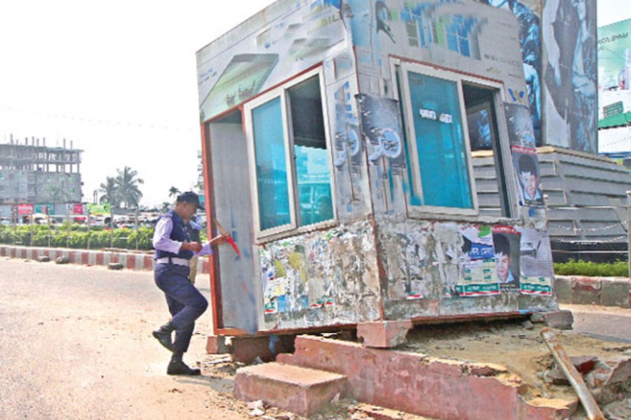 Although there is a permanent structure used as a police box for long in the corner of Khamar Bari, at Fram Gate on both sides of the foot overbridge, police boxes have been set up. These are hardly used. There is little doubt that like many such structures these two stand as an eyesore. Like the billboards, their ugly presence right at the eye level presents a disturbing sight. Already this city is ugly enough, there is no need to turn it uglier by illegal police boxes. If the law enforcers need it, let it be constructed by the city corporations on suitable and strategic sites not in places that is improper from the traffic safety point of view and also on aesthetic consideration.