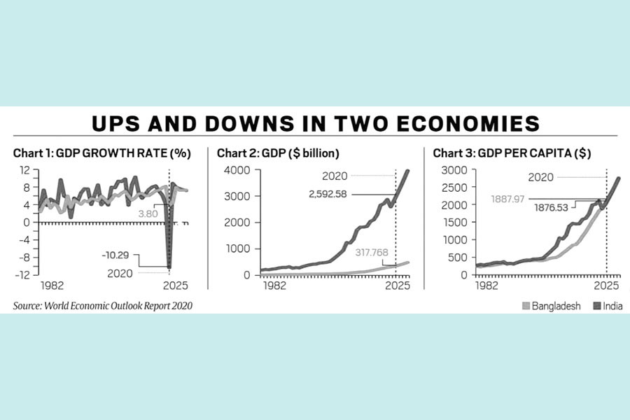 Yet, the mainstream Indian media is inconsolable, but the grief is not at all so much about the economic gloom faced by the country, it is the news that India's per capita income is projected to be lower than its neighbour Bangladesh in FY 2021. The IMF projection puts India's per capita income at US$1,877 while that of Bangladesh at US$1,888-- just a mere US$11 lead.