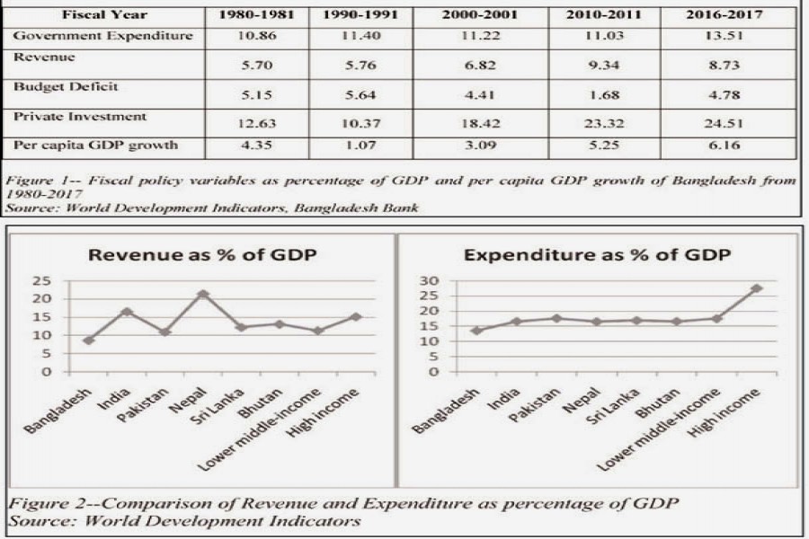 Public financing in Bangladesh has gone through diverse changes over the past few decades. Overview of the fiscal policy variables as percentage of gross domestic product (GDP) and per capita GDP growth of Bangladesh spanning from 1980-2017 are presented in figure 1.