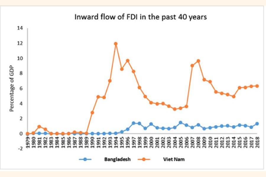 In recent times, Vietnam has emerged as one of the most successful Asian countries in attracting large volume of investments. Despite having identical trend of net FDI inflow (percentage of gross domestic product or GDP) in the late eighties, the scenario of Bangladesh and Vietnam altered drastically in later years. Vietnam has achieved successful implementation of FDI policy by opening up its economy at planned and successive stages. The reforms and implementation of investment laws helped to create a consistent legal system and created a common playground for foreign invested enterprises, state-owned enterprises and domestic private enterprises. The reforms included preferential treatment of foreign investment, decentralisation, reduction of bureaucratic red tapes. In addition, the key advantage that Vietnam weighed on further is the cheap yet relatively skilled labour force. While Bangladesh has maintained a steady investment of around 2 per cent or lower in both health and education, Vietnam has managed to spend around 4.0 per cent of GDP in these sectors. From the Vietnamese experience, thoughtful reform in health and education assisted in realising the potential of FDI inflow.
