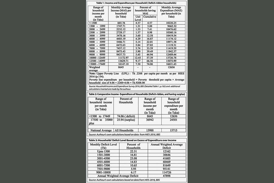 Table 2 shows a comparative scenario of deficit-ridden and surplus - bearing households of the country. The average monthly income per household of deficit group is 23.40 per cent of surplus group's average income. On the other hand, deficit group's income accounts for 54.07 per cent of national average income. Therefore, it is evident that three-fourths of the total households of Bangladesh were in financial distress while only one-third of the households were enjoying financial soundness five years back. Had not the detailed statistical table been analysed, the real financial condition of the majority of the people would not have been known.