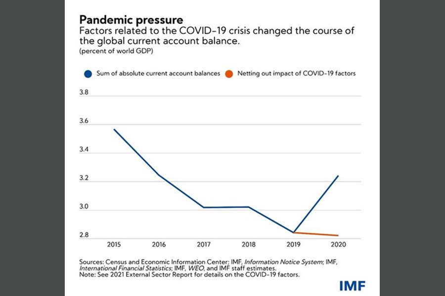 In our latest External Sector Report we found that the global reaction to the pandemic further widened global current account balances-the sum of absolute deficits and surpluses among all countries-from 2.8 per cent of world Gross Domestic Product (GDP) in 2019 to 3.2 per cent of GDP in 2020. Those balances are set to widen further as the pandemic continues to rage in much of the world. [FE ADDS: The current account deficit in Bangladesh in the last fiscal year (FY21), however, declined to $3.80 billion from $4.72 billion in FY20.]