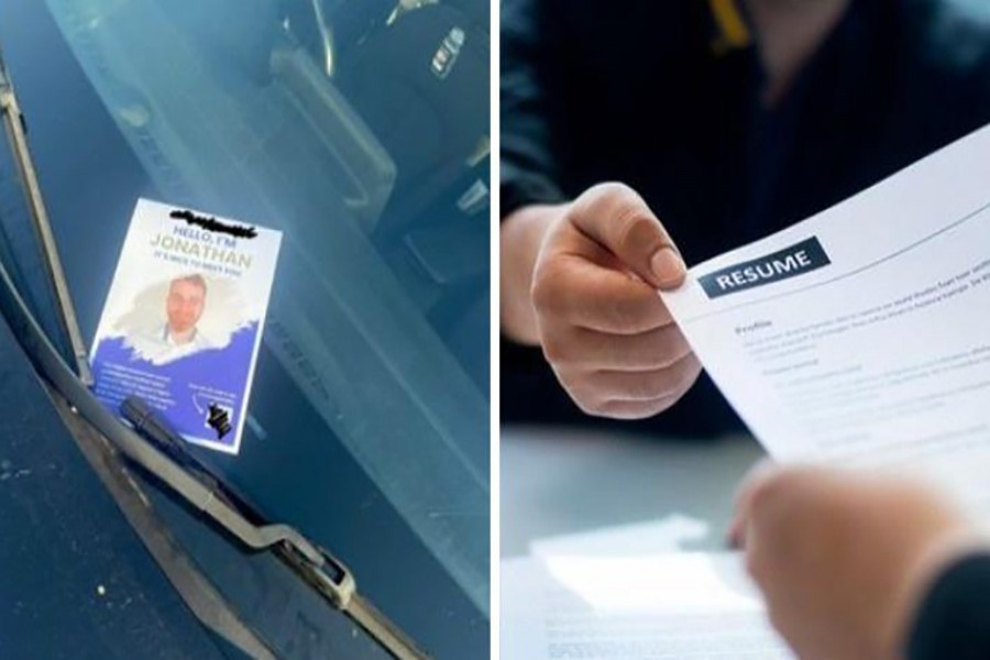 He recycled the flyers of the company to print his resume. He even added a QR link to his LinkedIn profile on the flyers.