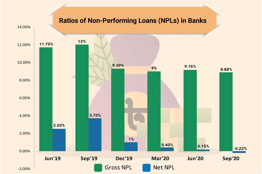 Bangladesh Bank data released recently has indicated that such loans -NPL-- stood at Taka 887.34 billion last year- down 5.93 per cent year-on-year. However, the central bank is yet to reveal the full data on the rescheduling and write-off loans for the final quarter of 2020. It is understood that the central bank prepared its statement by calculating the credits disbursed by the domestic and offshore banking units of banks operating in Bangladesh.
