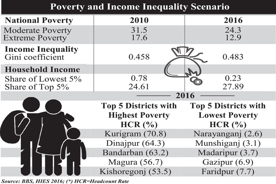 Since my article on the same topic was published on  November 12, 2017 in this newspaper, the Preliminary Report on Household Income and Expenditure (HIES), 2016 has been made available in the public domain. Therefore, it is important to look into the data to see what further changes that took place beyond 2010 to enhance our understanding and dynamics of  income inequality and poverty in Bangladesh.  As readers may be aware that all data on income distribution in Bangladesh come from this particular survey conducted on a fairly regular interval  by the Bangladesh Bureau of Statistics (BBS). These survey data remain the key source to make any informed discussion on the issue of income inequality and poverty in Bangladesh.