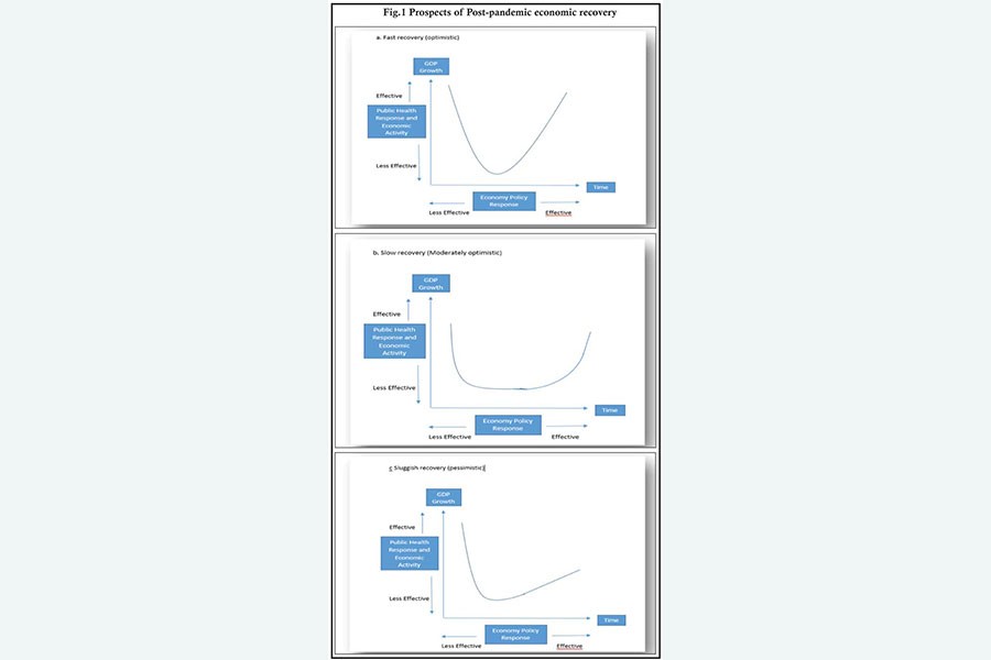 POST-PANDEMIC RECOVERY: To get on the recovery bandwagon once the Covid-19 situation is under control, the economy has to fire on all cylinders: monetary, fiscal, and trade policies, and anything else that could be mustered. Apart from domestic policies to support lives and livelihoods, to rejuvenate Small and medium-sized enterprises (SMEs) and large-scale manufacturing, trade openness with a competitive exchange rate will be the lynchpin of export success that could bring dynamism into the domestic economy. Global economic resurgence will be a critical factor in our own post-pandemic recovery which could take the following shape: (a) fast recovery (optimistic), (b) slow recovery (moderately optimistic), and (c) sluggish recovery (pessimistic), as depicted in Fig.1.