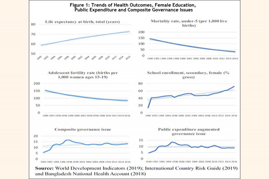 Bangladesh has made significant improvements in the health of women and children and has achieved its Millennium Development Goal (MDG) 4 (to reduce child mortality) and is on track to MDG 5a (to reduce maternal mortality). In 2010, the United Nations recognised Bangladesh for its exceptional progress towards MDG 4 and 5a to reduce child and maternal mortality in the face of many socio-economic challenges. Several factors outside of the health sector have supported reductions in maternal and child mortality. Female education is one of those factors which may have significant effect on the improvements in health outcomes of Bangladesh. In order to investigate deeper into these facts, Bangladesh Institute of Governance and Management (BIGM) has conducted a scientific econometric research assuming that rapid progress in female education may reflect the Bangladeshis' social responsiveness to change towards the improvement of health outcomes. The purpose of that paper was to see how the health outcomes (in case of life expectancy, under-5 mortality and adolescent fertility) are impacted by health expenditure (both public and private), per capita income in presence of overall governance and female education. The paper uses autoregressive distributed lag technique to estimate the models with data ranges from 1990 to 2016 under two different scenarios. Figure 1 shows trend of selected variables over the period 1990 to 2016.