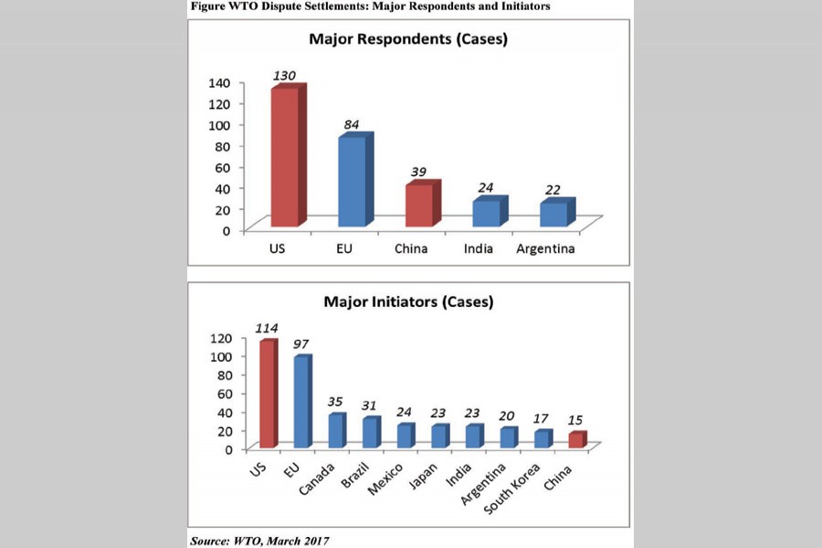Distressingly, some officials in Geneva see it all as an effort to collapse the WTO's dispute system, which restrains the kind of unilateral trade action that Trump would prefer. By 2017, the US had defended 130 cases and China nearly 40 before the WTO. Yet, China had applied only 15 times to initiate a dispute before the WTO, whereas the corresponding figure for the US is almost 10 times higher (Figure).