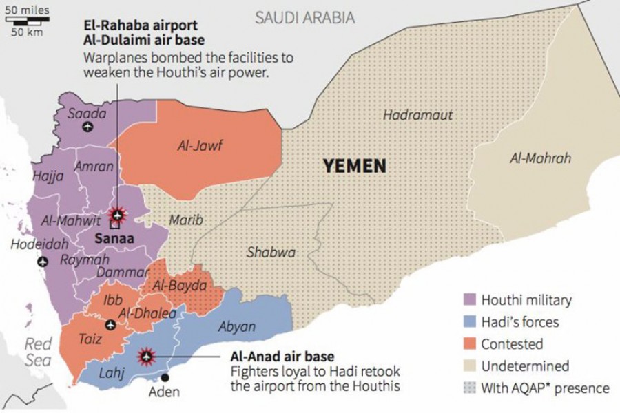 ESCALATION OF CONFLICT: The conflict escalated dramatically in March 2015, when Saudi Arabia and eight other mostly Sunni Arab states-- backed by the US, UK, and France-- began air strikes against the Houthis, with the declared aim of restoring Mr Hadi's government. The Saudi-led coalition feared that continued success of the Houthis would give their rival regional power and Shia-majority state, Iran, a foothold in Yemen, Saudi Arabia's southern neighbour.