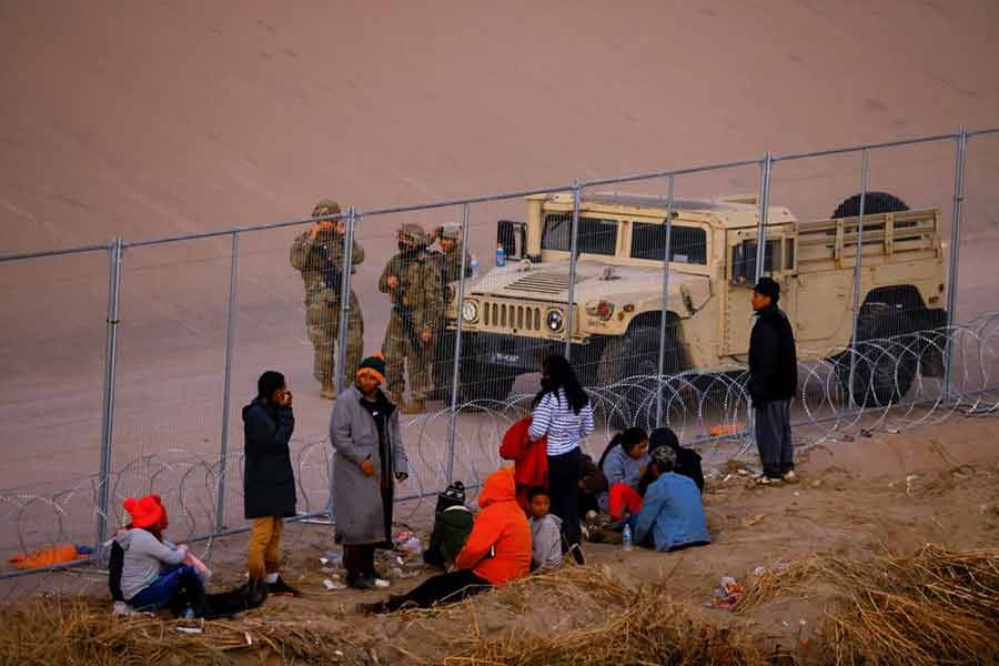 Asylum-seeking migrants standing by a barbed wire fence as members of the Texas National Guard stand guard on the banks of the Rio Bravo river, the border between the United States and Mexico, with the purpose of reinforcing border security and inhibiting the crossing of migrants to the United States, seen from Ciudad Juarez in Mexico on Saturday -Reuters photo