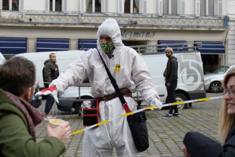 Two Belgian men left unemployed by the coronavirus pandemic have reinvented themselves as the “COVID boys”, disinfecting public surfaces and patrolling Brussels to encourage social distancing and mask wearing.