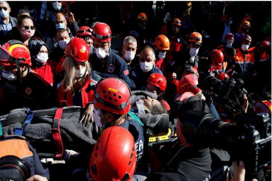 A mother and three of her children were pulled to safety on Saturday after being trapped for almost 18 hours under a building in the western Turkish city of Izmir that was flattened in a powerful earthquake, reports Reuters.