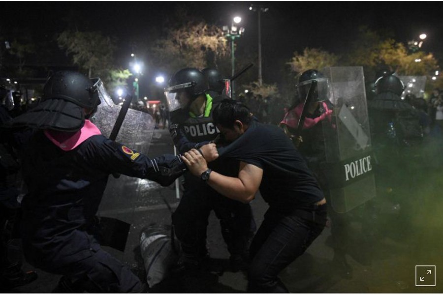 Hundreds of police in riot gear and shields advanced on different fronts against protesters to push people away from the Grand Palace. In some places they faced off with protesters who threw firecrackers.