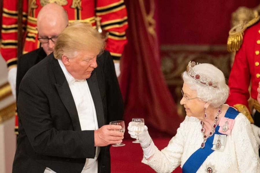 At a lavish banquet in Buckingham Palace, Trump praised the queen as "a great, great woman" and said the United States and United Kingdom shared an enduring alliance.